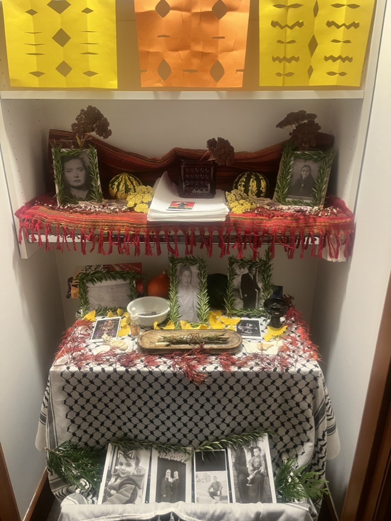 I placed my keffiyeh across a dresser, and used a spare blanket from the living room to drape across a shelf. I picked fallen ginkgo leaves and pine branches, and red leaves from the maple tree in the front yard, and scattered them across the cloth. I made my own version of papel picado by folding and cutting shapes into leftover colored paper from the residency office.